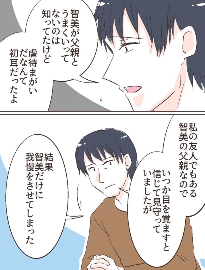 修吾は智美さんと父親がうまくいっていないことをなんとなく知っていた程度のようで、自分の両親から智美さんの生い立ちを初めて聞いて驚いた様子でした。義父は、自分の友人でもある智美さんの父親をいつか目を覚ますであろうと信じ見守っていたと言いますが、智美さんはあまりにも長い間、我慢と苦労を背負っていたのです。