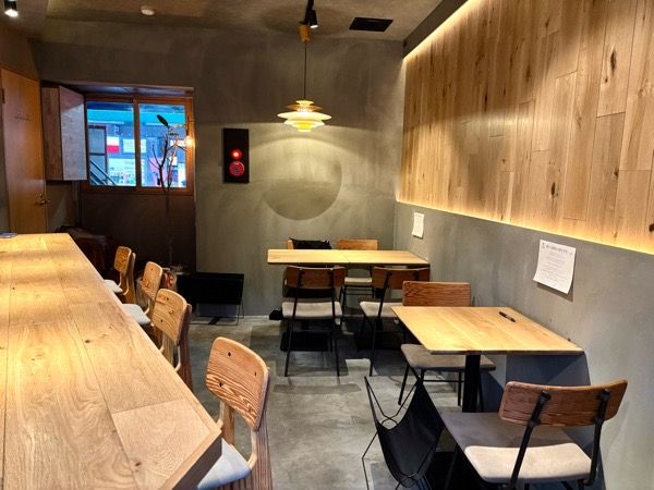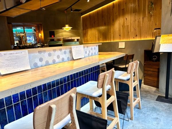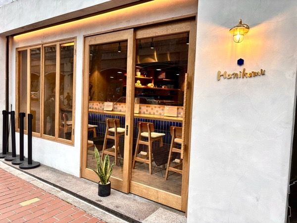 白地の壁に店名の「Hanikamu」のロゴ、外観は一見カフェ風です。手触りの良い六角形の手すりの引き戸を開けると、木のぬくもりが感じられる和モダンな空間が待っています。木の椅子はクッション性があり心地良いです。