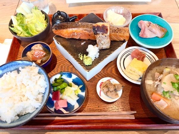 オープンキッチンでは、刺身でも食べられる銀鮭を炭火で焼く姿が見え、ライブ感が食欲をそそります。ご飯、豚汁、銀鮭のメインに小鉢を含めて全部で10種類。「懐石料理を一つのお盆に」をコンセプトに見た目も豪華、少量多品でご飯がすすむラインナップです。