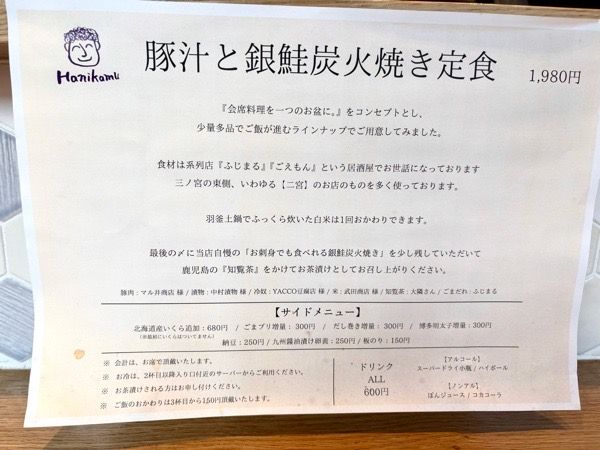 メニューは「豚汁と銀鮭炭火焼き定食」(1980円)の1品のみです。サイドメニューは、増量の他、北海道産いくら(680円)、納豆(250円)、九州醤油漬け卵黄(250円)、板のり(150円)などもありますよ。人気は北海道産いくら、卵黄だそうです。
