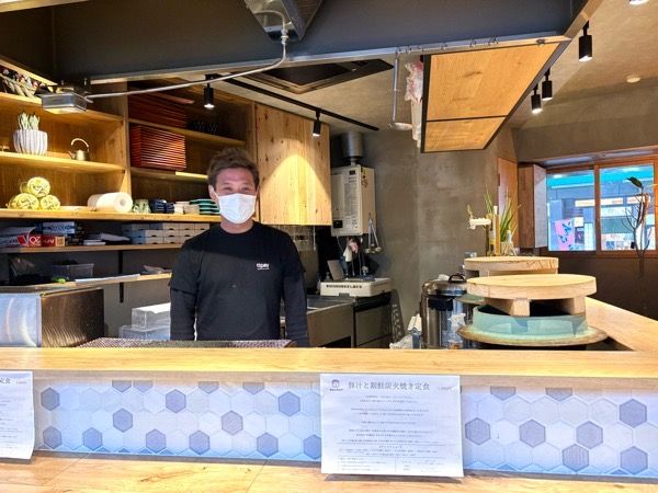 二宮にある系列店の「ふじまる」「ごえもん」は居酒屋のため夜間営業です。オーナーは、時代を見据え「女性が働きやすい職場」を考え昼の業態をスタートしました。店名の「はにかむ」は、夜から昼営業へ「謙虚な姿勢で」という思いや六角形のハニカム構造は強固なことから「手を取り合ってやっていこう」の意味がこめられています。店内のタイルもよく見ると「六角形」奥深い♪