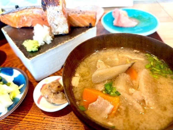 1センチ以上はある分厚い銀鮭は、自家製のタレに一晩漬け込み炭火でじっくり焼いた幽庵焼きです。大根おろしとわさびで味変も楽しめます。具だくさんの豚汁は豚肉がほろほろと柔らかく野菜のお出汁がしみたやさしい味で、朝食にベストマッチです。