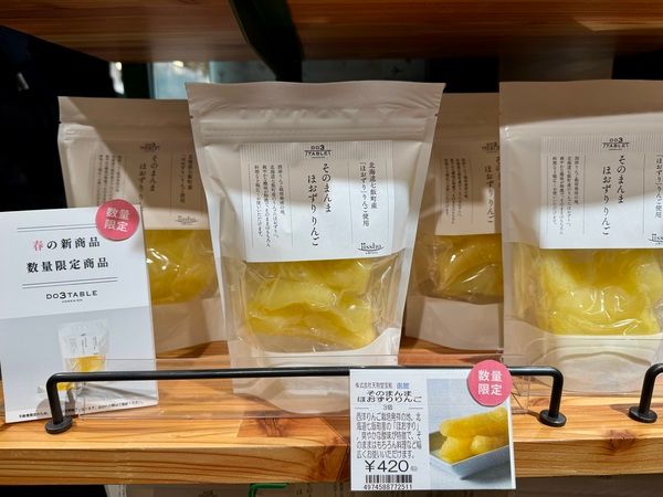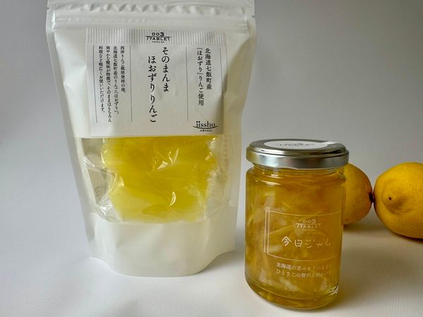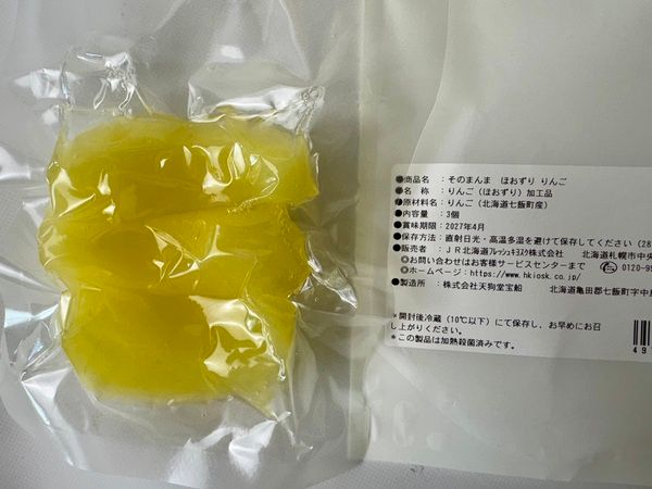 西洋りんご栽培発祥の地、北海道七飯町産の「ほおずり」という品種を使用。砂糖を使わず、真空パックで加熱・加圧する「レアフル加工」で作られています。
