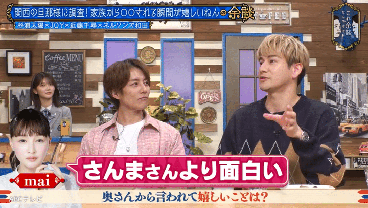 山内の「奧さんズレてはるんですか?」というツッコミや、濱家の「奧さんの好みもあるやろ。少数やで。少数やけど」という発言にもめげることなく、「だからさんまさんと一緒に収録したあとも、JOY君の方がウケてたよねみたいなことを言ってくれて。僕のテレビで大爆笑してくれるんですよ」と言い切ると、共演者の近藤千尋から「ステキな奥様」という声があがった。