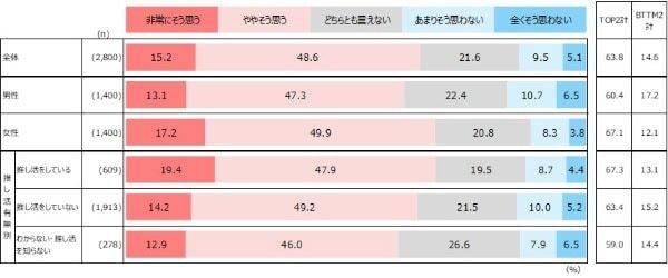 推し活をしている人の自己肯定度(自分に価値があると思う)は50.6%、していない人は43.1%でした。こちらも推し活をしている人の方が7.5pt高く、明確な差が見られました。