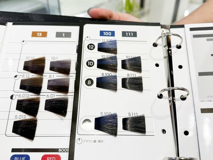 今回筆者の髪に使うのはイノアカラーの新ライン「イノアファッション」から2月に登場した「トリプルアッシュ」コレクション。3種の異なるアッシュ系色素を配合していて、日本人特有の赤みやオレンジみを効果的に抑え、ブリーチなしでも鮮明で濁りのない、理想の“透けツヤ”アッシュカラーを表現するといいます。