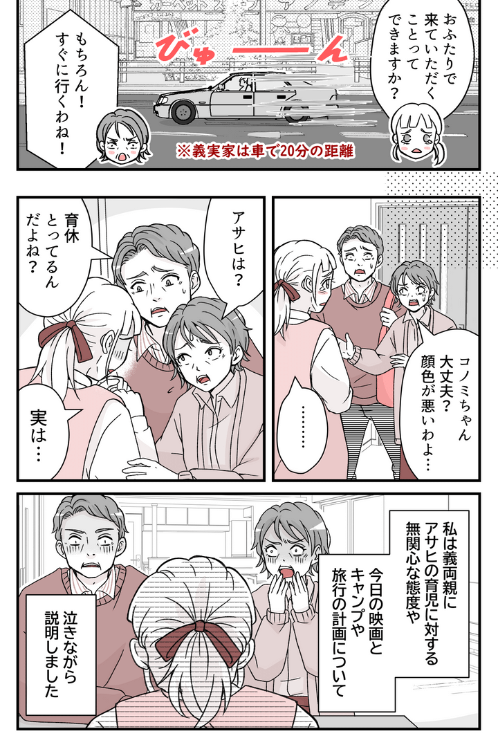 私のSOSに義両親はすぐに駆けつけてくれました。玄関のチャイムが鳴って私がドアを開けると、義両親が心配そうな顔で立っています。私は義両親に、アサヒの育児に対する無関心な態度や、今日の映画やキャンプや旅行の計画について、泣きながら説明しました。義両親は私の話を真剣な表情で聞いてくれました。