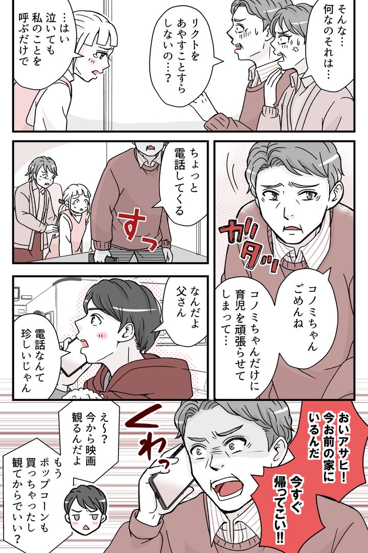 駆けつけてくれた義両親に、アサヒの育休中の様子をすべて話しました。怒りをあらわにした義父はすぐにアサヒに電話。「育休は遊びじゃない、すぐに帰ってこい!」と一喝してくれました。