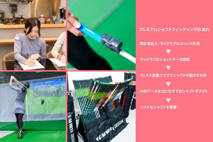 ツアープロの使用者も多いシャフトメーカー「グラファイトデザイン」。シャフトフィッティングというとハードルが高く感じてしまいますが、軽量スペックはもちろん、軽量モデルもラインアップされているので、自分に合うシャフトを見つけられるのが魅力です。由佳さんが体験したドライバーフィッティングの流れは以下のとおり。