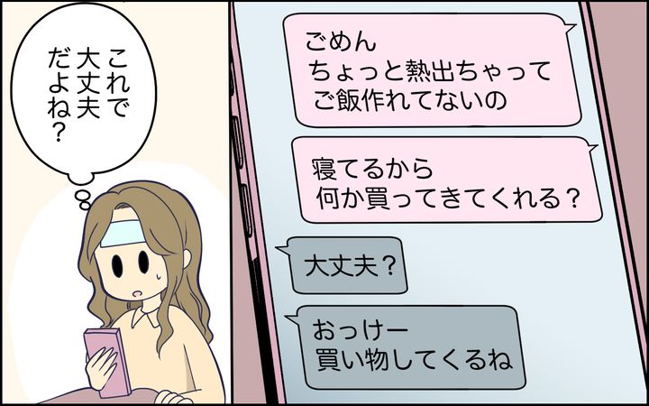 「熱を出して寝てるからご飯作れてない。何か買ってきてくれる?」と夫に伝えたら、たいていの人は察してくれますよね? 妻である私の分を買ってこなかったのは百歩譲って我慢できるとしても、せめて子どもが食べるものを買っていこうと考えるのが親ではないでしょうか。それとも私のメッセージが言葉足らずだった!? いやいや、そもそも私は熱があってフラフラしてるんだから、そんなメッセージの内容を細かく考えるほどの余裕もないのです。