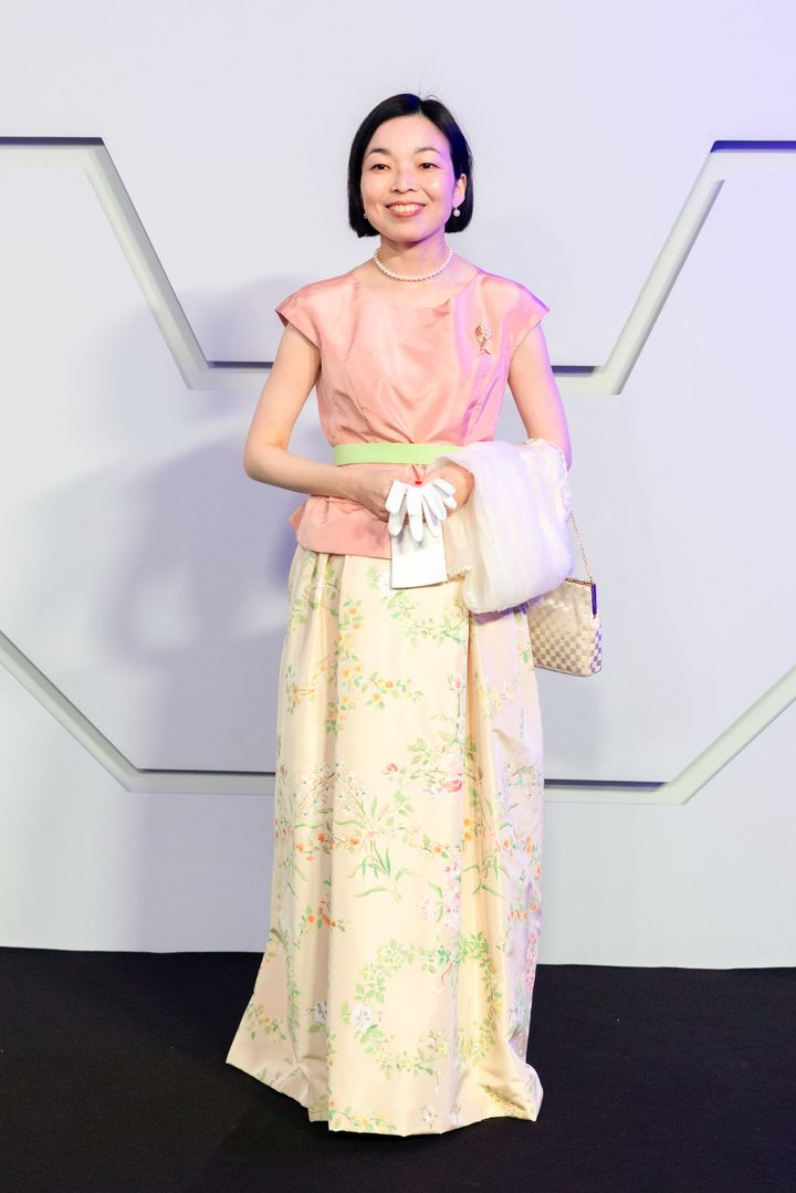 彬子さまが選ばれたのは、春の訪れを感じさせる柔らかなパステルカラーのロングドレス。スリーブレスのすっきりとしたトップに対し、広がるスカート部分には可憐な小花の刺繍が繊細に施され、奥ゆかしくも確かな存在感を放っていた。首元にはパールネックレスとイヤリングを合わせ、端正な気品を演出。