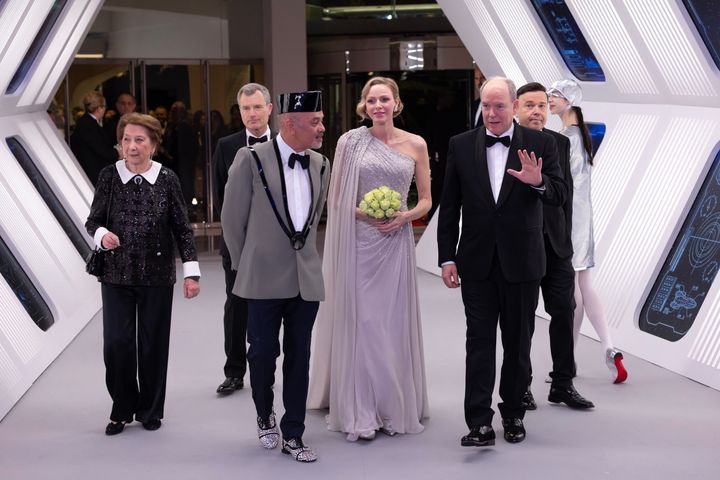 その傍らで圧倒的な存在感を放っていたのが、テーマである「宇宙」を独自の解釈まとったシャルレーヌ公妃である。公妃が選んだのは、シルバーのスパンコールが全面にあしらわれた、エリー・サーブのアシンメトリーなオフショルダードレス。近年の彼女が好む、シャープで自立した女性像を反映したかのようなモダンな一着は、歩くたびにケープが優雅に舞い、まるで銀河を漂う天女のような輝きを放っていた。