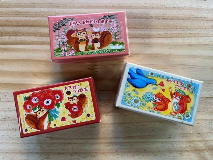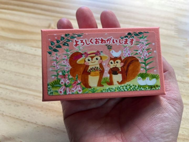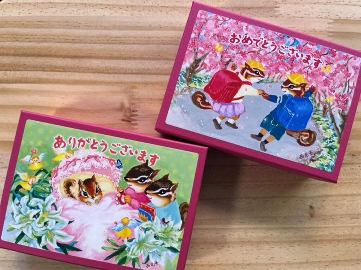 西光亭には、ほかにもメッセージ入りのクッキー箱がたくさんあります。こちらは、小箱ではなく、少し大きめの、ハガキサイズくらいの箱のシリーズ。くるみのクッキー、チョコくるみクッキー、アーモンドクッキー、ごまのクッキー、チーズのクッキーなど12種類から選ぶことができます。