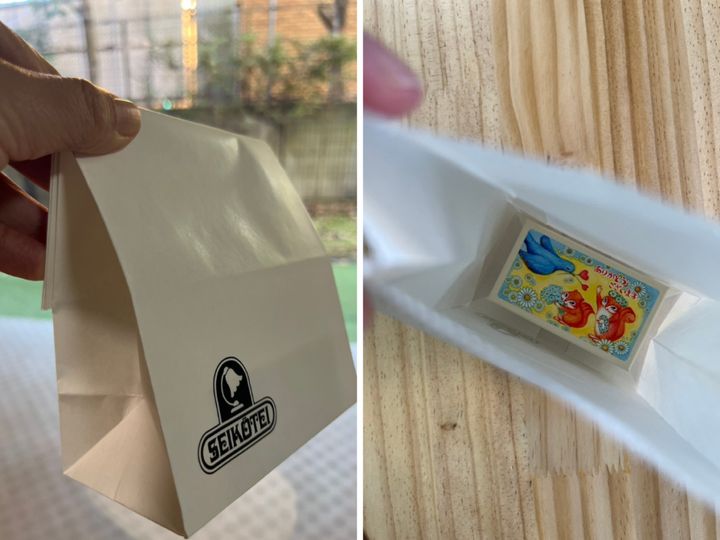 小分け袋がついてくるので安心。袋は、底面が小箱よりひとまわり大きいくらい。まさにちょうどいいサイズ。メッセージカードなども、いっしょに入れることができますね。