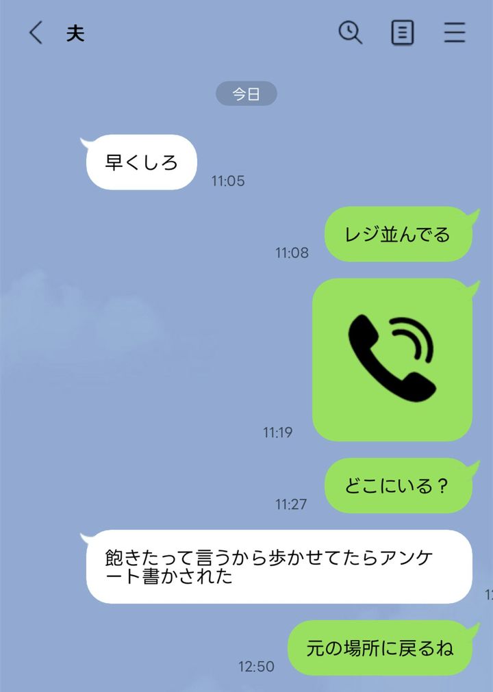 旦那から「早くしろ」とLINEが入っており、「レジ並んでる」と伝えました。