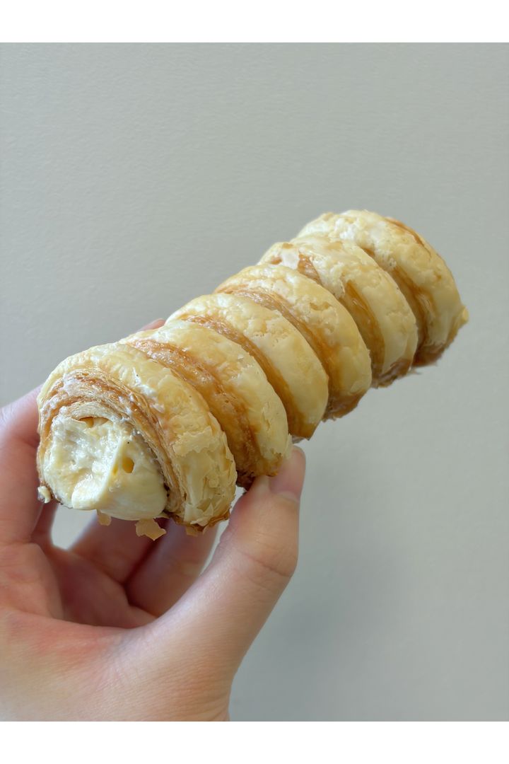 「クニャーネの下側はカリカリにキャラメリゼされていて、ザクッとしたパイとの食感のコントラストが絶妙。中には、とろっとなめらかなクリームがたっぷり入っていて、約10㎝の食べ応えのあるサイズながら、ペロリと食べきれてしまうおいしさです。さまざまなフレーバーをみんなで食べ比べてみるのはいかが?」