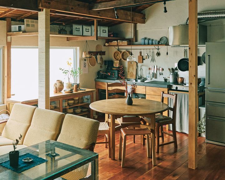 ゆったりとした時間が流れる京都市左京区・浄土寺エリア。中根嶺さんがこの地に工房兼ギャラリーと住居を構えたのは5年前のこと。「不動産屋で築100年ほどの町家に出合ったんです。住まいの空間にした2階は、人が住むためには解体が必要で。本当は適度に改装できる空間が理想だけど、これ以上の物件が見つからなくて。給水・排水、床の張り替えなどを、自分が手を動かして頑張る覚悟を決め、改装はすべて自分の手でやり切りました。今は何でもYouTubeで調べられるので、そこで情報収集して」と嶺さん。 自分らしい部屋を整えるのに、その“狭さ”はうってつけの条件なのかもしれません。 狭くて、居心地のいい部屋を紹介している …