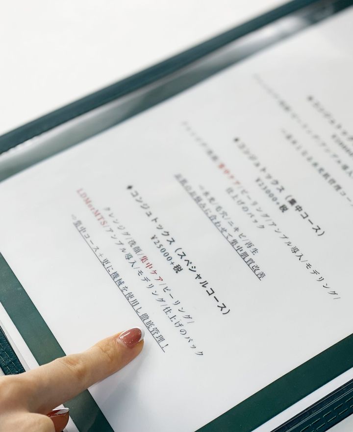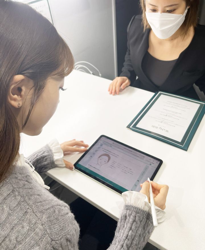 施術が終わると、アフターカウンセリングへ。最初に記入したカウンセリングシートをもとに、ホームケアで続けていいケア、見直したほうがいいケア、アイテムを変えたほうがいいポイントなどをアドバイスしてくれます。