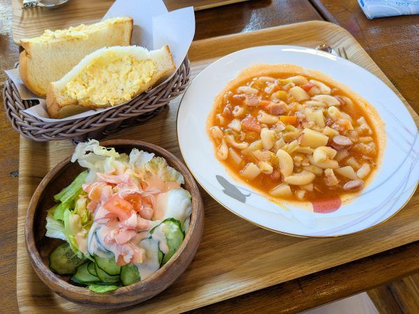 手作りの日替わりランチは、月ごとに毎日メニューが変わるそうです。 この日のメニューはミネストローネ・サラダ・サンドイッチ。
