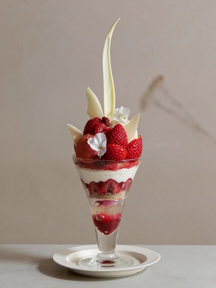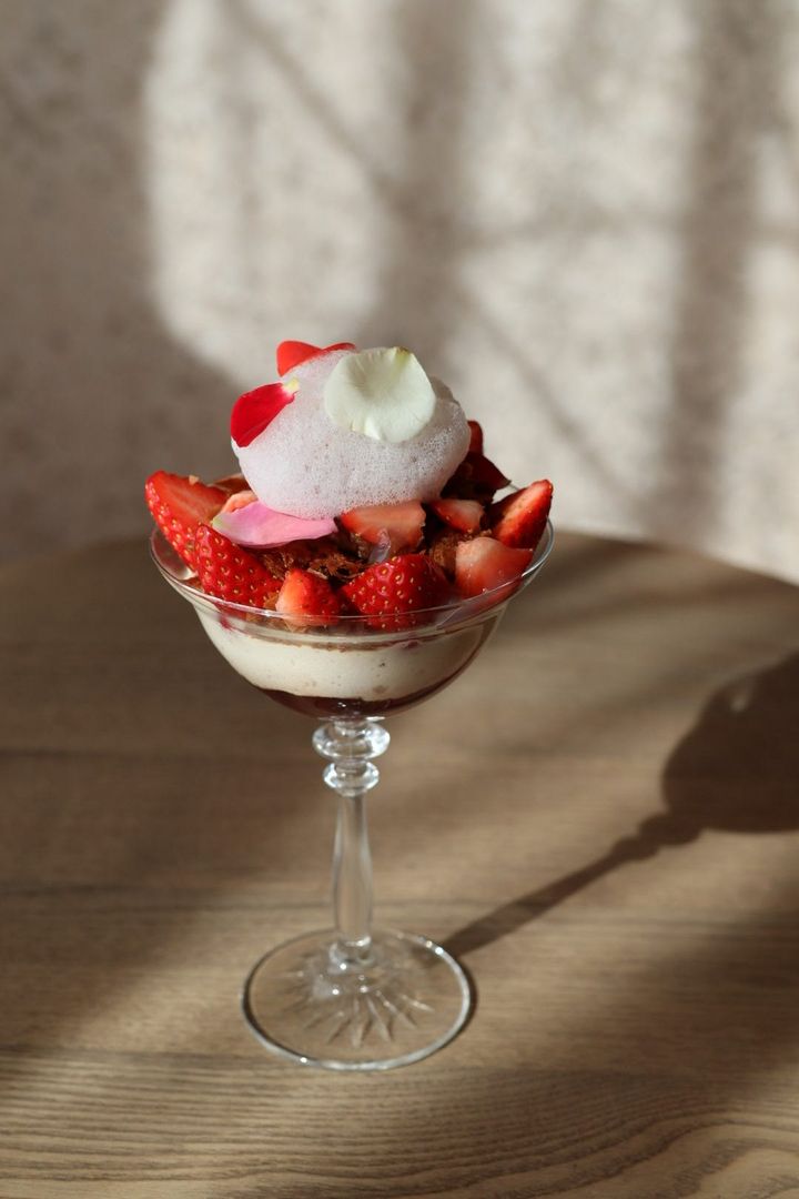 ペストリーシェフ・野口ゆきえさんが手がけるパフェは、ヴィーガンチョコレートのムースと甘酸っぱく芳醇なカシスソースをベースに、メープルシロップでコク深くねっとりと仕立てたバナナココナッツアイスや、フレッシュ感が弾けるレモンソルベを重ねています。さらに、くるみ入りヴィーガンブラウニーやヴィーガンチョコクランチ、カカオニブ入りチュイルを重ね、カカオ感をいっそう引き立てている。季節の果物(今ならいちご)が華やかな香りを添えていきます。