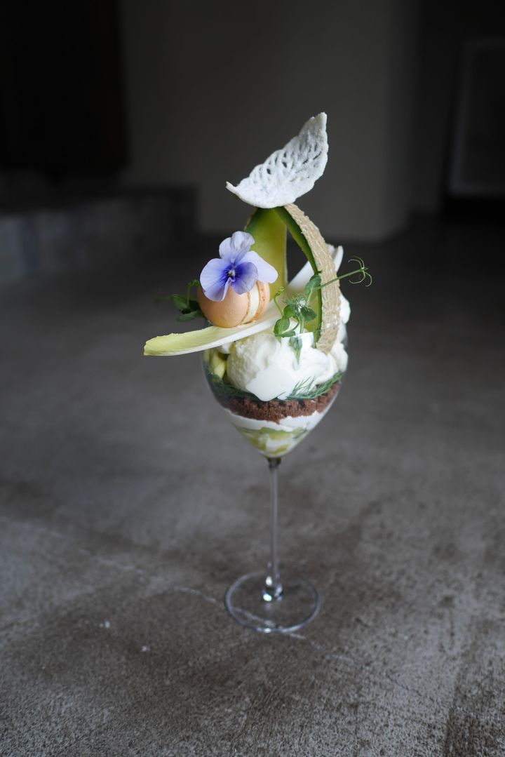 「Nami zaimokuza(ナミ ザイモクザ)」での、物語をお皿に紡ぎ出すコンセプチュアルなコースの中で、メインデセールを担うのがパフェ。この5月には、初のメロンパフェが登場します。