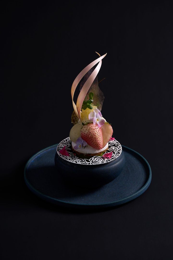 クリームやアイスに香る桜を軸に、白いちごや桜でマリネしたいちごが果実味を底上げし、バラ香るマスカルポーネムースでフローラル香の幅を広げて。食べ進むごとに白味噌やお茶などさまざまな香りと相乗し、最後はベルガモットジュレや八朔などの柑橘ですっきりとシメる仕立て。