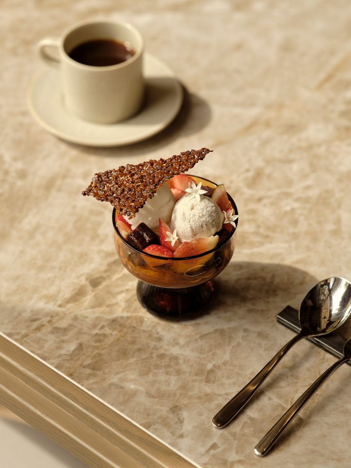 名だたるレストランでデザートを作ってきた江藤英樹シェフにとって、パフェはデザートの延長。だから素材感はしっかりでいて、どこまでも軽やかでやさしい。