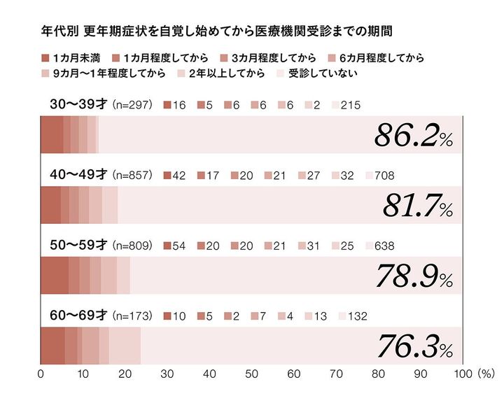 更年期に関しては、下のグラフのように症状を自覚しても病院を受診しない人が圧倒的に多く、世代関係なく7~8割を超えている。月経の不調に関しては、情報発信が多くされるようになり、婦人科で治療する人は増えてきているというが、更年期障害に関しては「年齢のせい」「仕方ない」と我慢している人も多い。柴田医師は、婦人科治療は女性の一生を支える医療だという。
