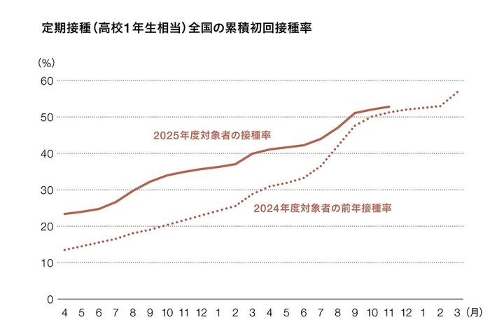 2013年から2022年まではHPVワクチンを積極的に勧めることを控えていた。副反応に関する正しい情報が出てきて伸びてきたものの、依然として接種率は世界レベルからみるととても低い。出典:ワクチンJAPAN(厚生労働省協力)HPVワクチン接種データ 2025 Hearst Owned