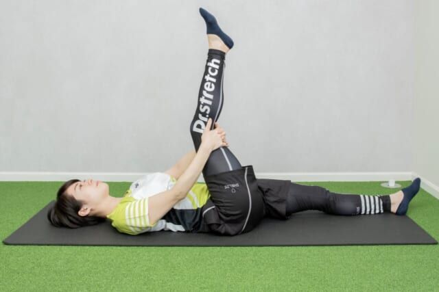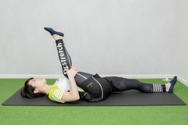 息を吐きながら太ももを胸に近づけるようにゆっくり引き寄せます。心地よく伸びる位置で10秒キープ。反対側も同様に行い、これを1セットとして1日5セットを目安に続けます。