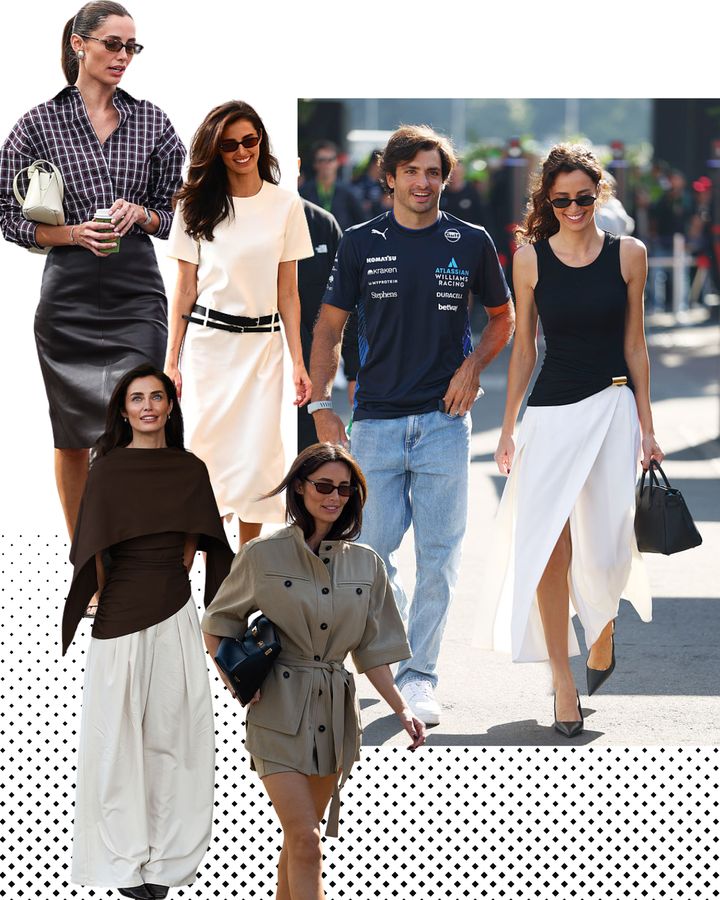 華やかなドレスやグラマラスな装いが目立つパドックにおいて、ジョージ・ラッセル(メルセデス所属)のパートナーであるカルメンの着こなしは一歩引いたようなほどよいカジュアルさが特徴的。クロップドジャケットや、シャツ、ストレートパンツといったベーシックなアイテムを軸にしながらも、かっちりしすぎないシルエットや軽やかな素材で、リラックスした空気感をつくっている。