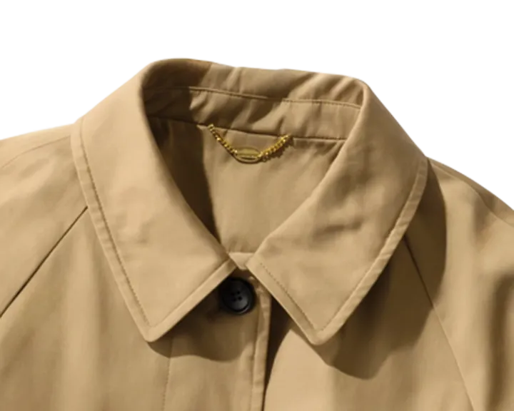 「ケープは取りはずしできる2way仕様になっています。シンプルなショートトレンチとして着るのもオススメで、えりの裏側のタブをとめれば、スタンドカラーとしてのアレンジも!」