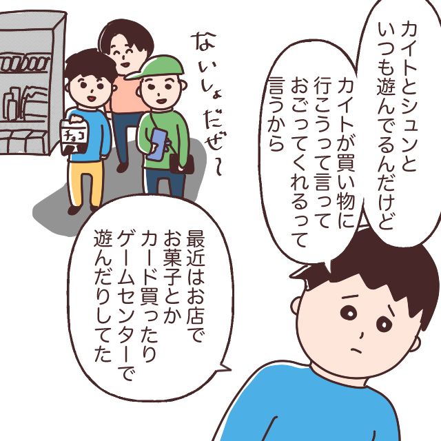 レンは、このまま黙り続けるのは無理だと思ったのか、しばらく間を置いてから、友達との間に何があったのかを少しずつ話し始めました。レンは、仲の良い友達カイト君とシュン君といつも3人で一緒に遊んでいました。それは知っていましたが、ある日、カイト君が「おごってあげるから買い物に行こう」と言い出したのをきっかけに、お店でお菓子やカードを買ったり、ゲームセンターで遊んだりすることが増えていったみたい。公園や、誰かの家で遊んでいたとばかり思っていた私は驚きました。