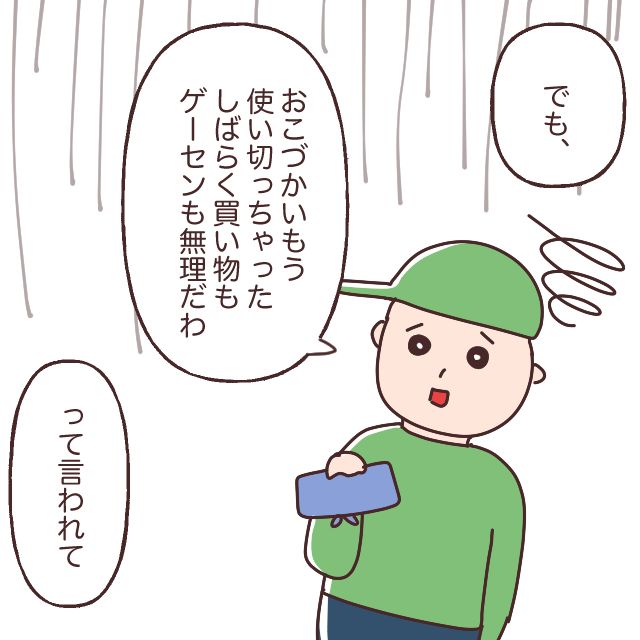 しかし、小学生がそんなにたくさんのお金を持っているはずもなく、やがてカイト君のお小遣いは底をついてしまいました。カイト君は「お小遣いもう使い切っちゃった、しばらく買い物もゲーセンも無理だわ」と残念そうな表情をします。