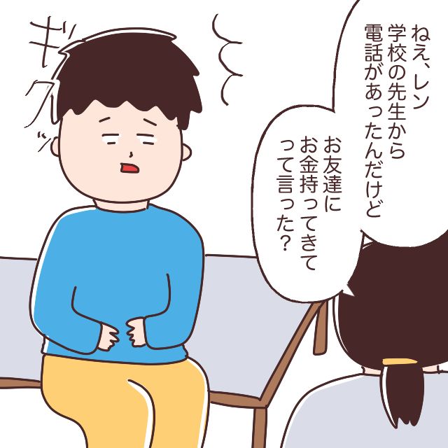 ある日突然、レンが通う小学校から「レン君が友達にお金を持ってくるように言っている」という驚きの連絡を受けた私。さらに、最近自分の財布のお金が少し減っていたことを思い出し、「もしかしてレンが関わっているのでは?」と思った私は、真相を確かめるため詳しく話を聞いてみることにしたのでした。