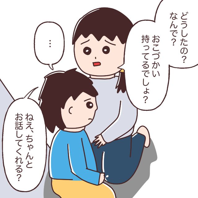 何も話そうとしないレンに、私は「どうしたの?なんで?おこづかい持ってるでしょ?」と必死に理由を聞き出そうとします。それでもレンは黙ったままうつむくだけ。私はレンの目をまっすぐ見つめると「ねぇ、ちゃんとお話ししてくれる?」と、できる限り優しい声で言いました。
