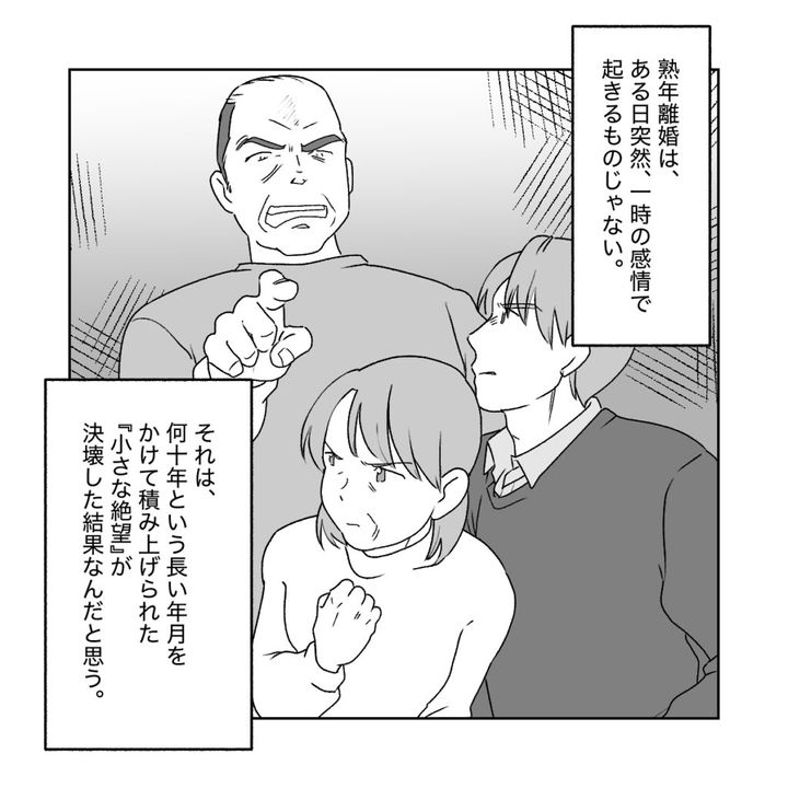 義母の話を聞いて、熟年離婚はある日突然、一時の感情で起きるものではないなと感じました。義母は小さな絶望を何十年も積み上げてきたのですから。