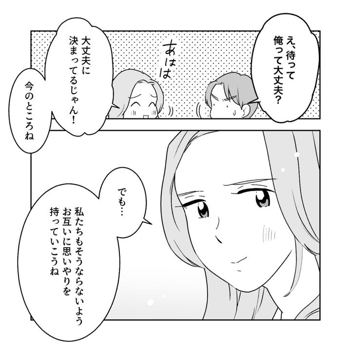 「俺って大丈夫?」と少し慌てたコウに「大丈夫に決まってるじゃん」と笑って答えた私。今のところはとても順調に、幸せな結婚生活を送っている私たち夫婦。将来義母のように熟年離婚なんてことにならないように、お互いに思いやりを持って行こうね、とコウに伝えました。