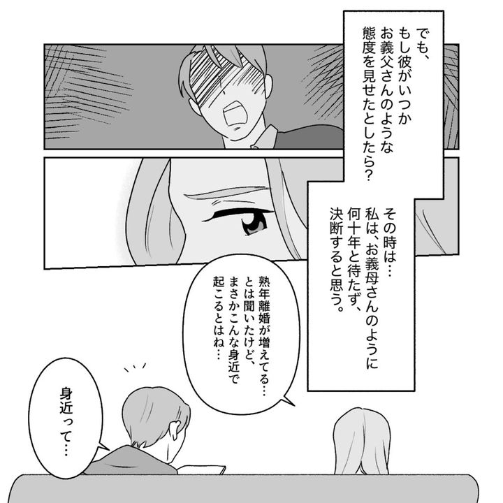 義母の家を訪れた時、突然の義母の離婚宣言に驚いたアイさんですが、夫コウさんも承知している様子です。義母とコウさんが話し合ってアイさんには会わせないよう、関わらせないようにしてきた義父とどういう経緯で離婚に至ったのか。アイさんは義母の長い離婚計画を知ることになります。義父は結婚してすぐから高圧的で傲慢なモラ夫に変わってしまいました。離婚や女性の自立に関しての仕組みや情報がまだあまりない時代、じっと耐えてきた専業主婦の義母でしたが、ある日離婚した友人から、離婚するつもりがあって、待てるのなら夫の退職金まで待った方が良いとアドバイスをもらった時に、義母は義父が退職するその日まで、自立の準備をしながら息子コウさんのために耐え抜こうと決心したのでした。それから15年経ち、義父の定年の日にとうとう義母は離婚を宣言しました。当然罵声を浴びせ、結婚を渋った義父でしたが、別居から離婚調停、長い月日をかけてとうとう離婚できたのでした。義母が幸せならそれでいいと微笑んだアイさんです。