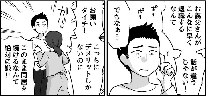 義父がこんなに早く退職するなんて、話が違います。日中ずっと家にいられることを考えただけで私は息が詰まりそうでした。かといって私たちがこの家を出れば家賃がかかってしまいます。そうだ、義両親に出ていってもらえばいいんだ……!