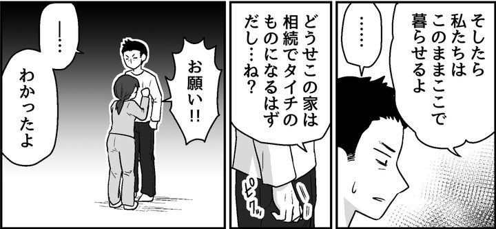 どうせこの家は相続でタイチのものになるはず。義両親亡きあとの暮らしが少し早く来たと思えばいいのです。私がそう訴えると、タイチも「わかったよ……」と首を縦に振ってくれたのでした。