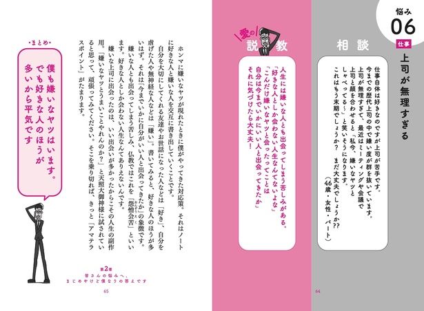 「上司が無理」「友人がうざい」「死が怖い」など多岐にわたる悩みに、吉本新喜劇での座長経験、母親の看取り、単身赴任しながらの子育て、音楽フェスや親子ゲーム大会主催など、さまざまな経験をもとに真面目に回答してくれる。時に仏教の教えを引きながら、どんな悩みにも独特のウイットを忘れず「自分ならどうする」と等身大で悩みに寄り添う姿には、まさに「愛」が溢れている。