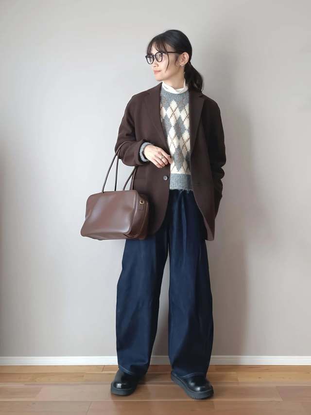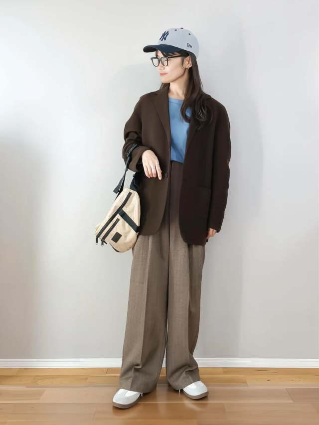 次にご紹介するのは、茶色ジャケットに同系色のパンツを合わせるワントーンコーデ。似た色を組み合わせることで統一感が生まれ、無条件でおしゃれ見えが叶う嬉しいスタイリングアイデアです。スナップではインナーのブルーをアクセントにして、ほんのりカジュアルに。