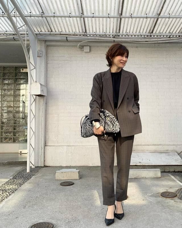 ジャケットとパンツのセットアップを活用して、茶色のワントーンコーデを楽しむのもおすすめです。組み合わせを考えることなく着るだけでおしゃれが決まるので、毎日忙しい大人の女性にもピッタリ!