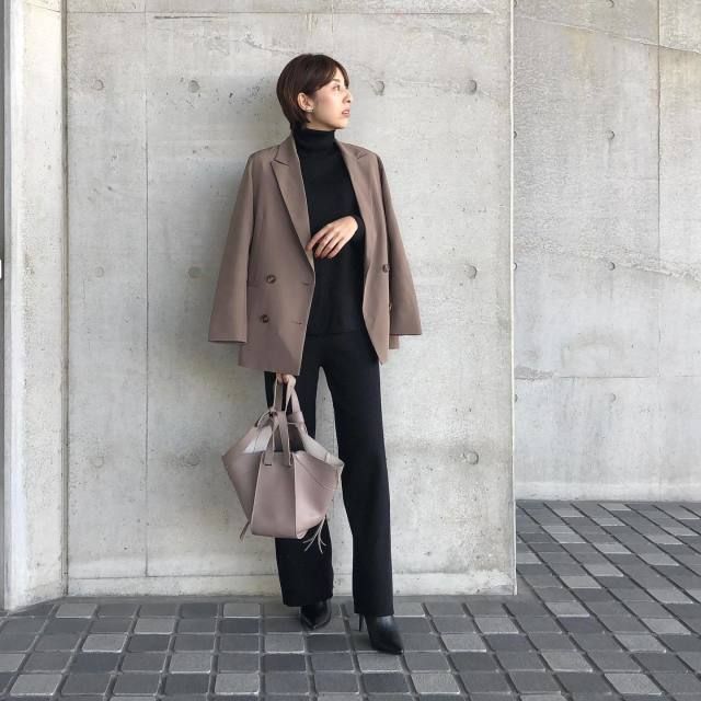 まずご紹介するのは、茶色ジャケットに黒パンツを合わせたコーデ。優しい印象の茶色ジャケットを黒で引き締めると、グッとクールな顔映えになりますよ。大人っぽく着こなしたい日にイチ押しの組み合わせです。