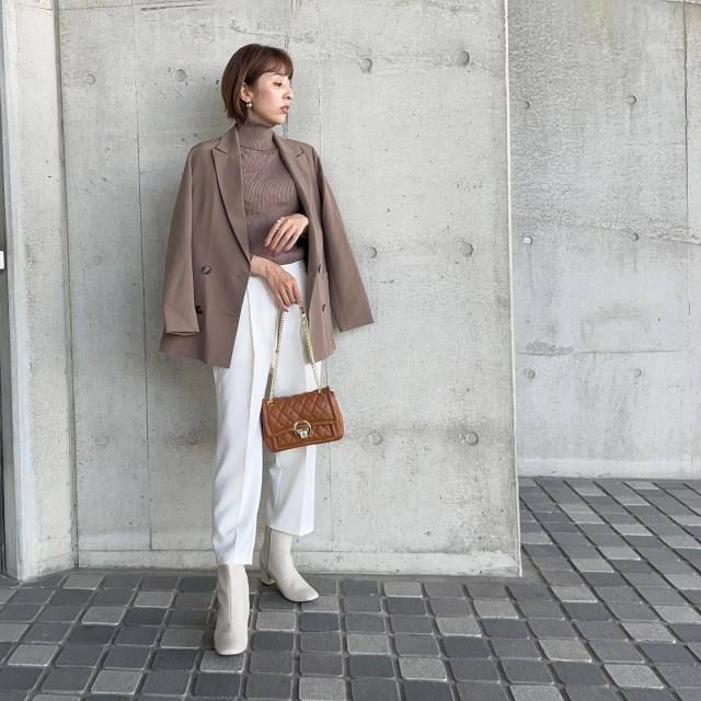 茶色ジャケット×白パンツは清潔感のあるおしゃれな組み合わせ。抜け感たっぷりで軽やかに仕上がり、クリーンで上品な印象も強まります。茶色と白のシャキッとした色のメリハリが、きれいめコーデをファッショナブルにまとめてくれますよ。