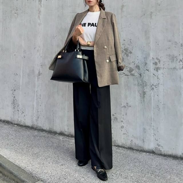 スナップではトップスインナーも黒で統一し、すっきり見えるIラインをメイク。おしゃれにスタイルアップできるお手本コーデです。