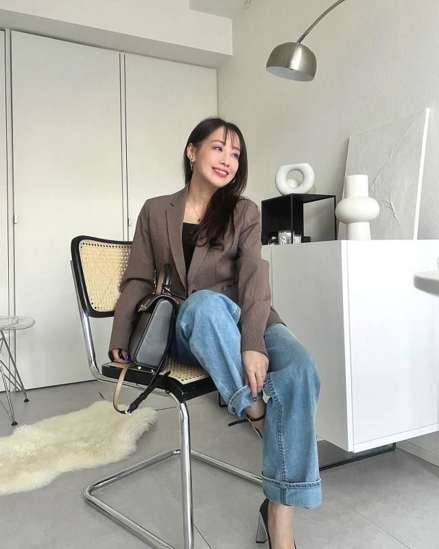 ライトブルーのデニムパンツを合わせれば、茶色ジャケットコーデがパッと明るく爽やかな印象にシフト。カジュアル度は上がりますが、茶色の上品な色合いがスタイル全体をヘルシーにまとめてくれますよ。