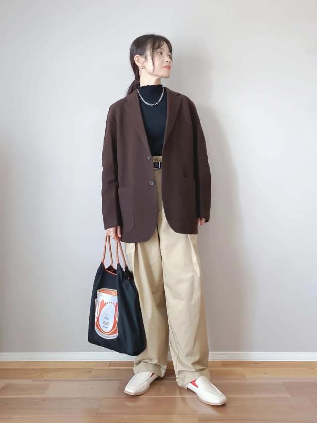 もう少し明るい印象を作りたい方には、茶色ジャケット×ベージュパンツの組み合わせをご提案。ボトムスが淡い色になることで、茶色ジャケットコーデがパッと明るく軽やかな印象にシフトしますよ。上品な色合わせなので、ちょっとカジュアルなパンツでも大人っぽく着こなせます。