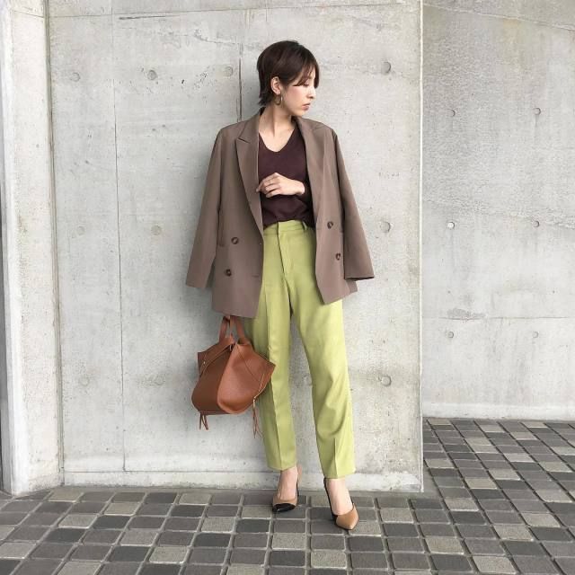 こちらは、茶色と相性のいいライムグリーンのパンツを合わせたコーデ。インナーやバッグ、小物を茶色系で統一しているので、ライムグリーンのパンツが着こなしのアクセントになっています。このようにスタイリングの色味を2~3色にまとめれば、カラーパンツ合わせも難しくありません。